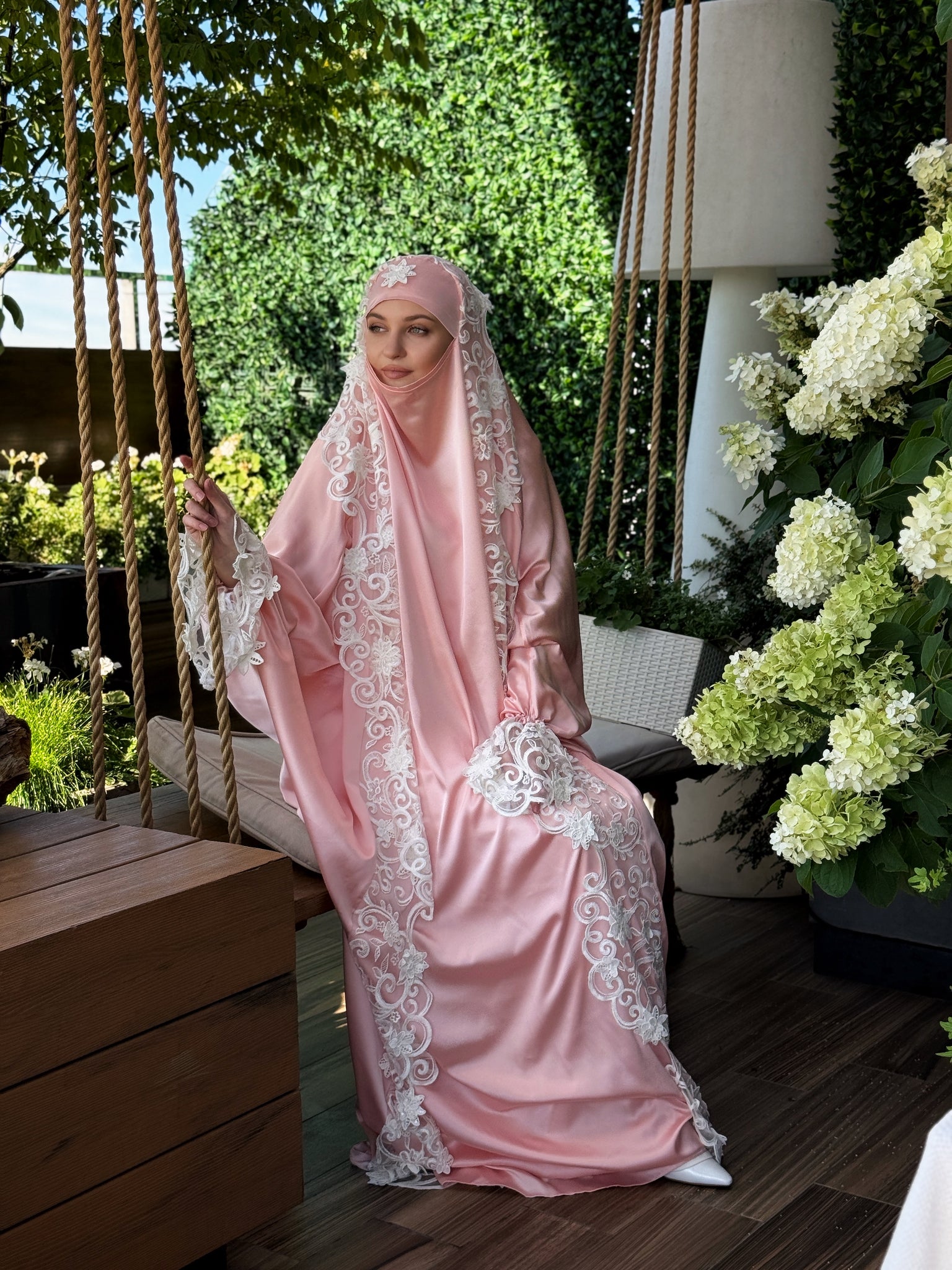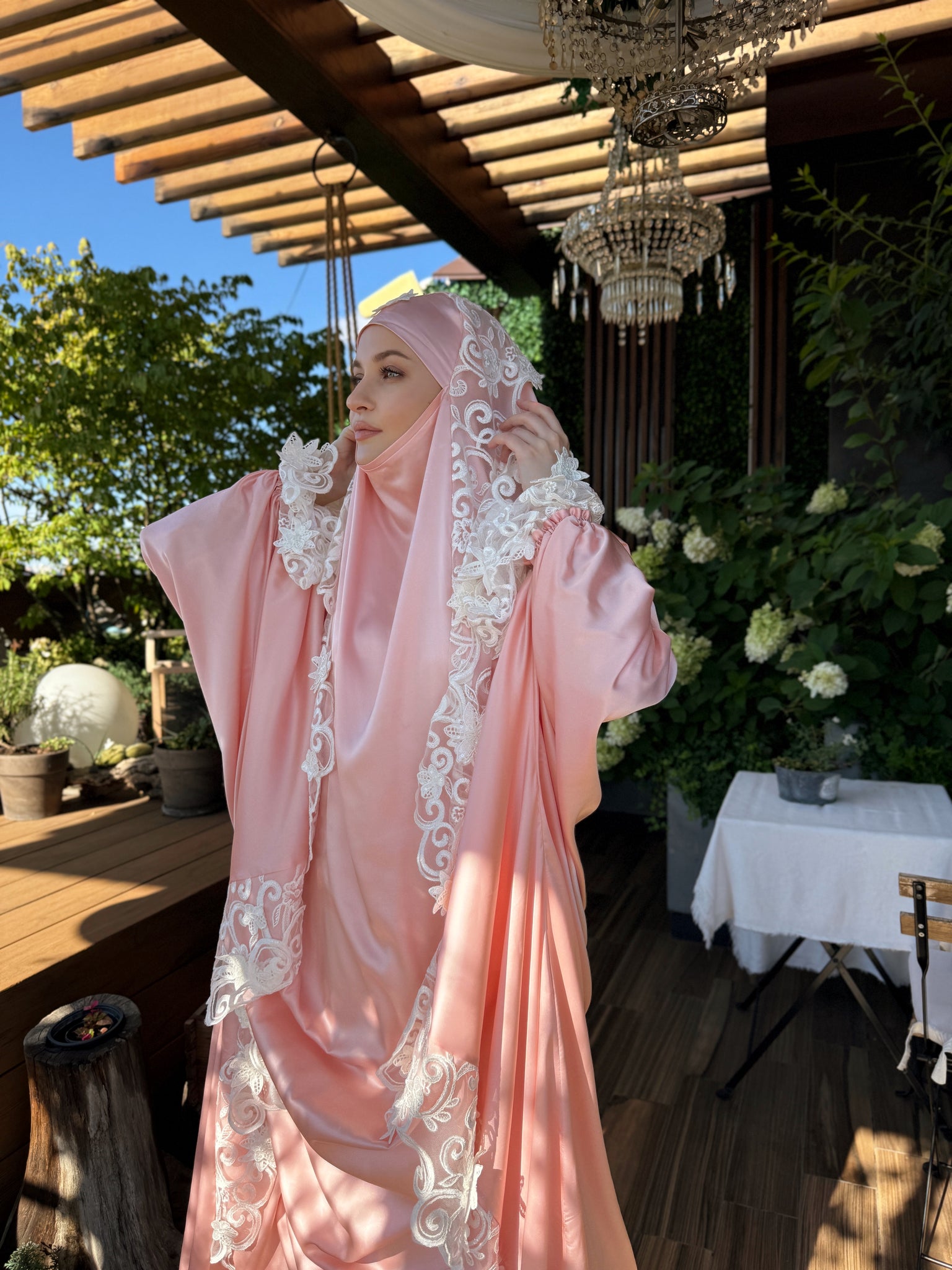 Silk jilbab with lace veil, full length khimar, Islamic modest dress, occasion abaya, custom fit jilbab – this breathtaking piece is crafted from luxurious satin silk in a soft blush tone. The white embroidered lace forms an elegant veil that drapes beautifully over the front and cuffs, adding a sophisticated and delicate touch.