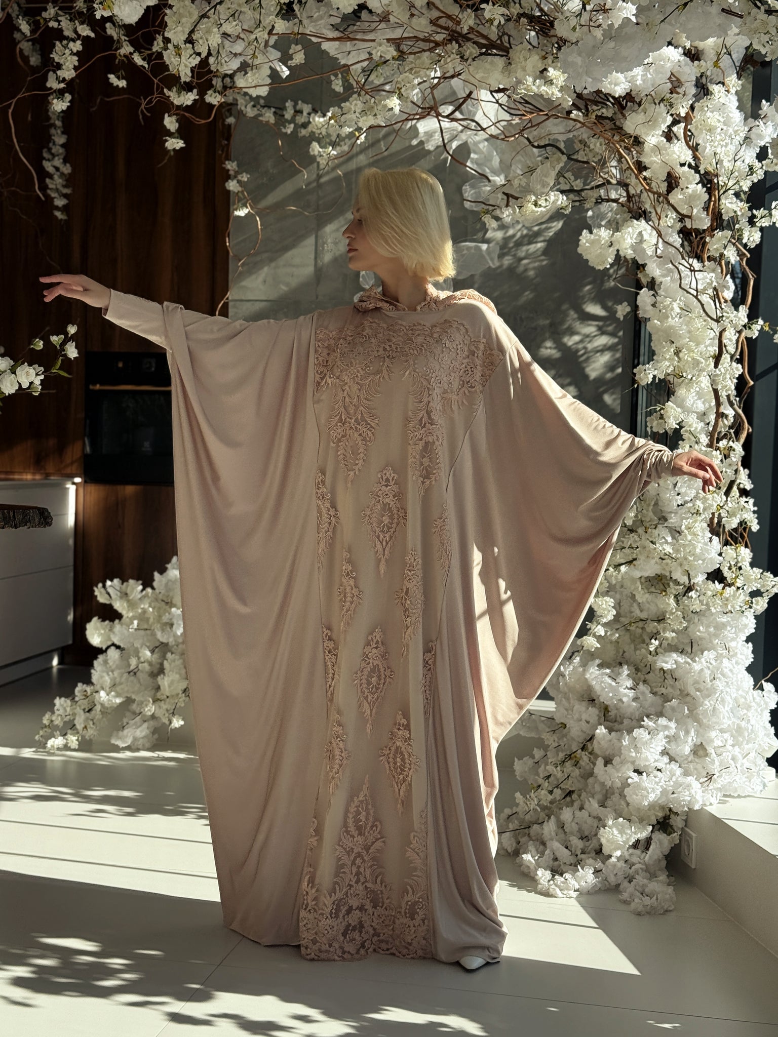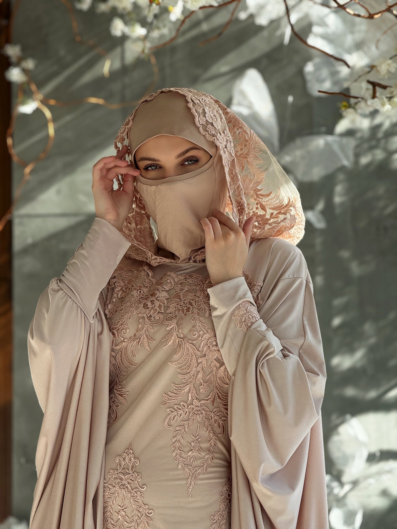 Elegant Beige Dress with Lace Hood, Jilbab Dress
